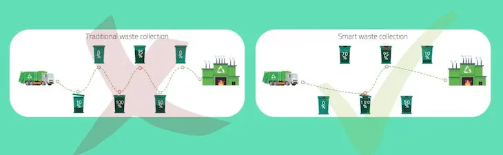 These smart containers can then transmit their real-time fill level information to waste collectors. Using this data, waste collectors can select optimum routes for waste collectors with areas in urgent need of cleanup on priority while avoiding units that still have room.